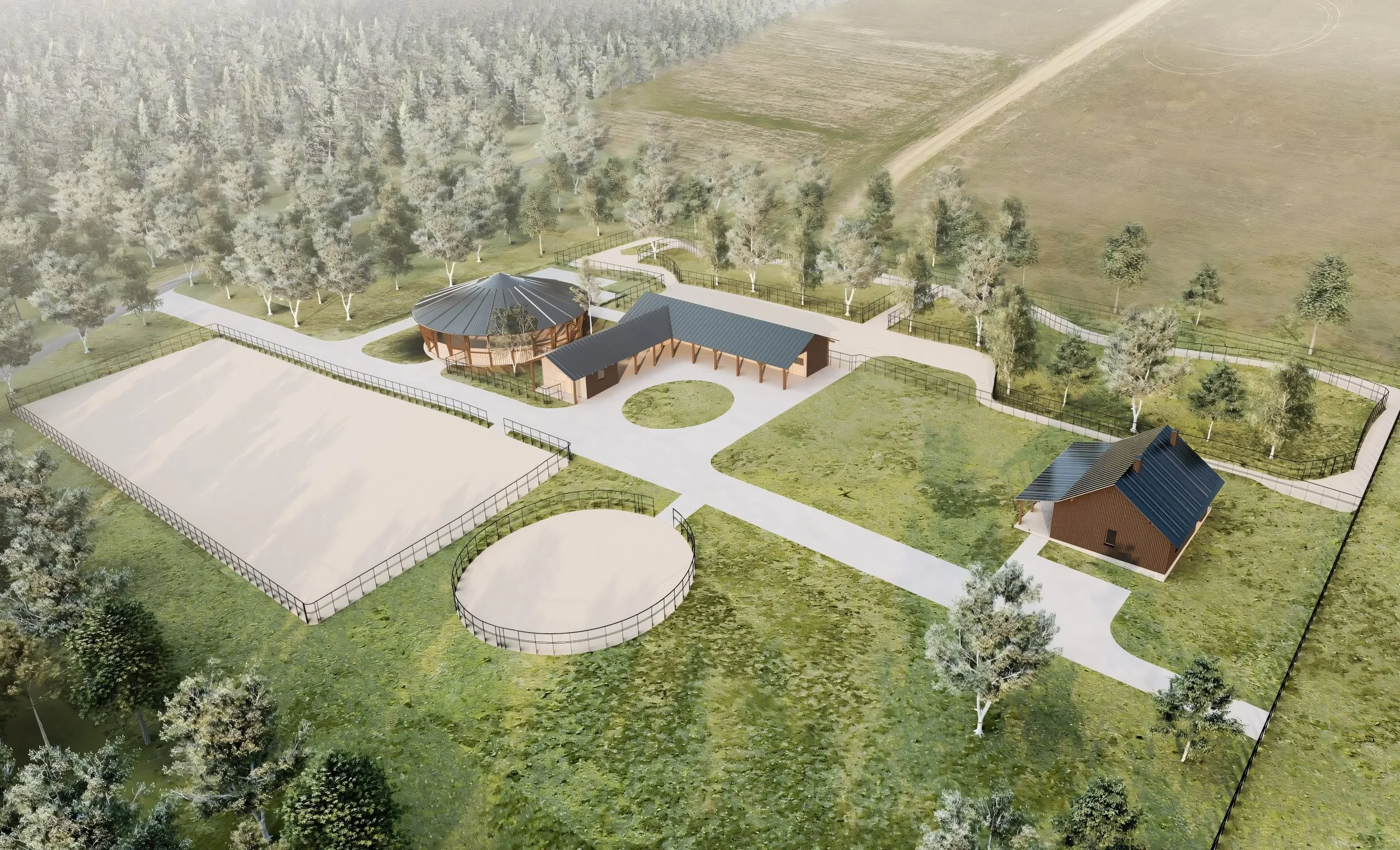Projekt przydomowej stajni w otoczeniu łąk i lasów. Składa się z domu rodzinnego, niedużej stajni i obory, a także lonżownika, hali i ujeżdżalni zewnętrznej. Na prośbę Inwestorów przy projektowaniu pastwisk i padoków uwzględniono ideę „paddock paradise” .